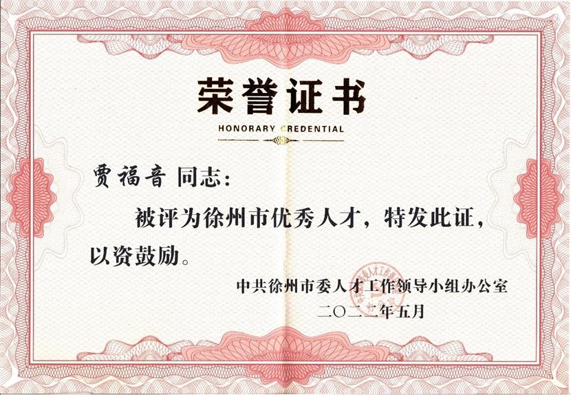近日,根据中共徐州市委组织部发布的85名徐州市优秀人才拟表彰对象名单公示,徐州市工大三森科技有限公司董事长贾福音同志荣获“徐州市优秀人才”称号。