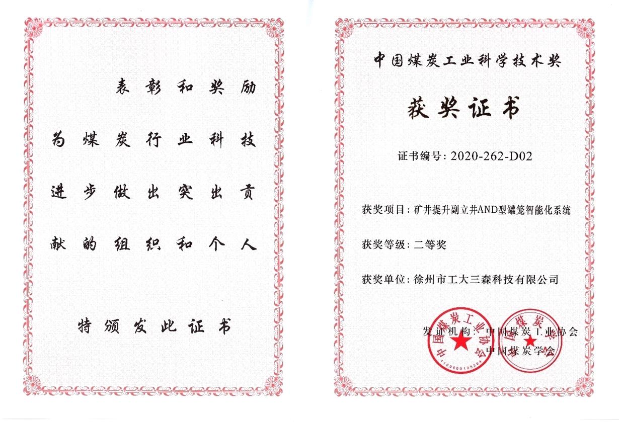 Recently, the project "Intelligent System of Mine Lifting Auxiliary Shaft AND type Cage" undertaken by our company as the second completed unit won the second prize of China Coal Industry Science and Technology Award 2020.