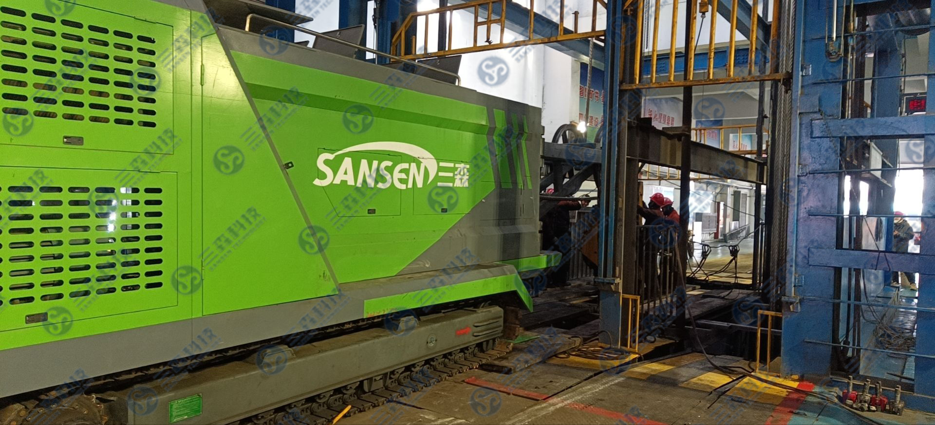 陕西彬长集团孟村矿副井采用落地式多绳摩擦提升系统,提升高度740m,提升绳直径54mm,提升绳数量为4根。12月30日,孟村矿采用三森智能换绳车进行首绳更换,仅用9小时30分顺利完成副井首绳更换任务,为矿井提升系统安全高效运行提供了保障。